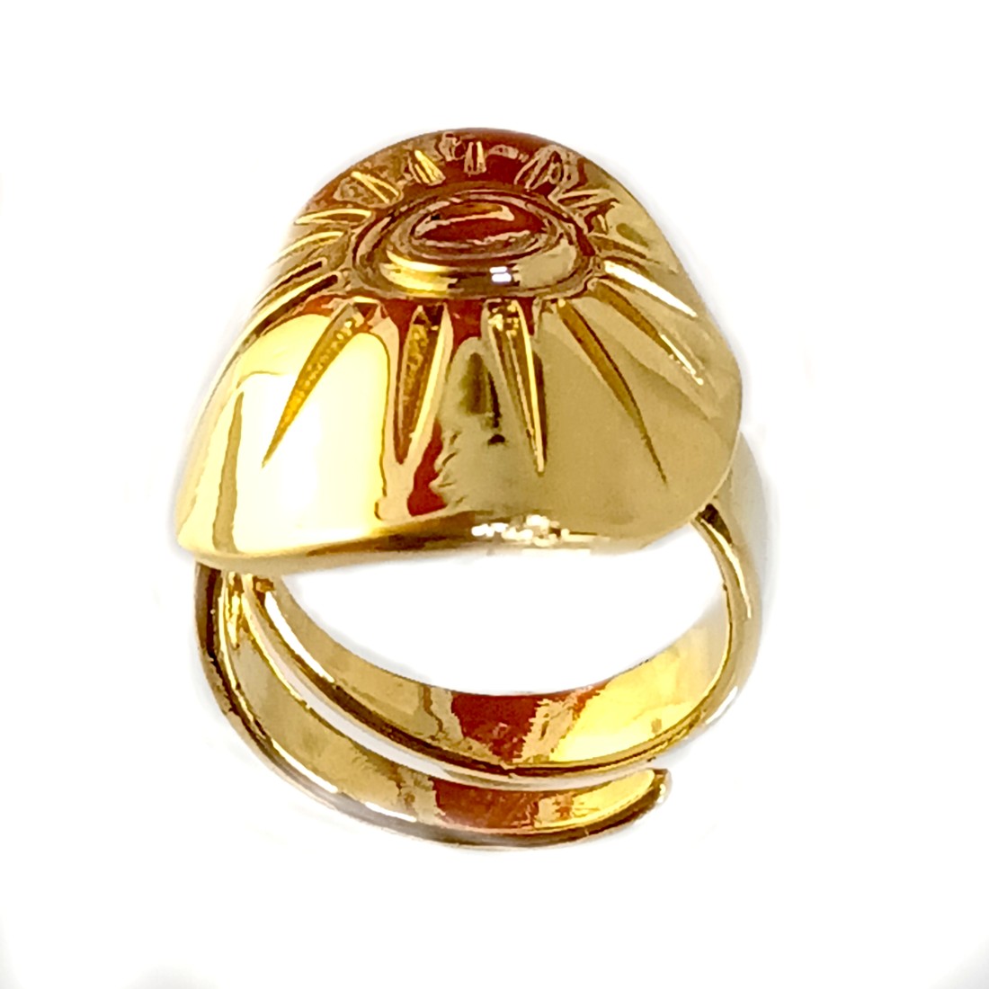 Bague conçue par le créateur français. Elle est plaquée or à 3 microns. Vous pouvez l'agrandir de plusieurs tailles. Largeur : 22 mm, longueur : 26 mm.