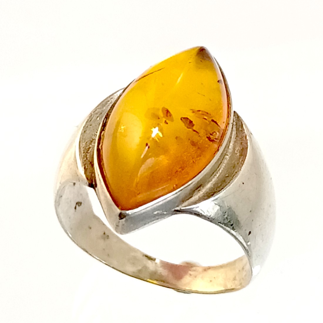 Bague pour femme, en argent massif, comprenant un cabochon en ambre véritable. Le poids de la bague est d'environ 5,3 grammes. Largeur : 21 mm.