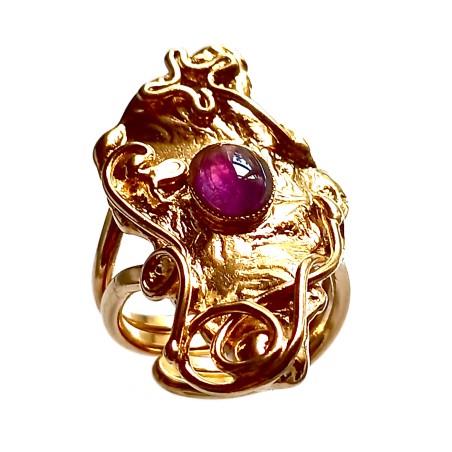 Bague dorée (2 micromètres), taille réglable (on peut agrandir facilement de la taille 54 à 60). Elle est ornée d'une très jolie améthyste en forme ovale. La pierre véritable apporte beaucoup d’authenticité à cette bague en forme baroque.