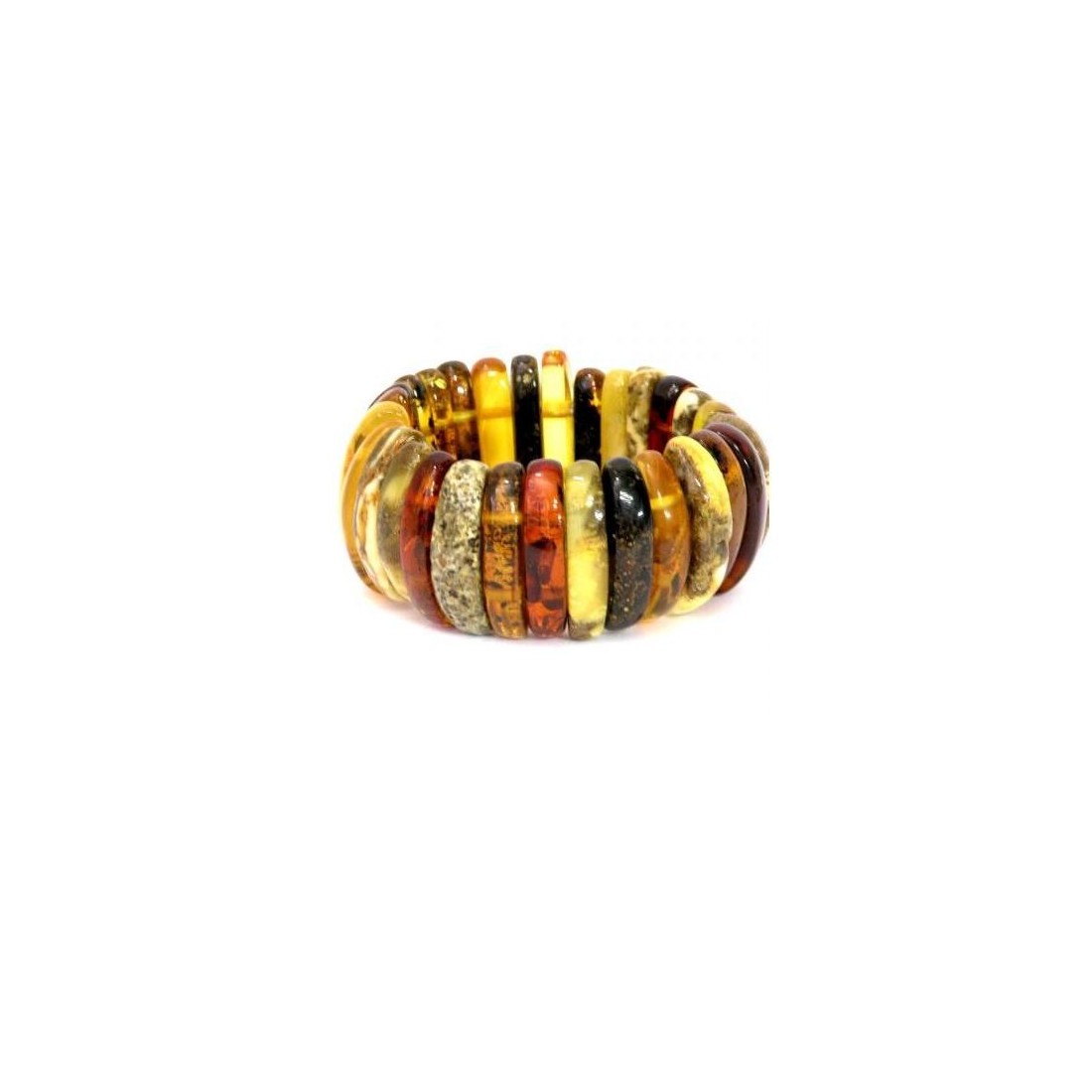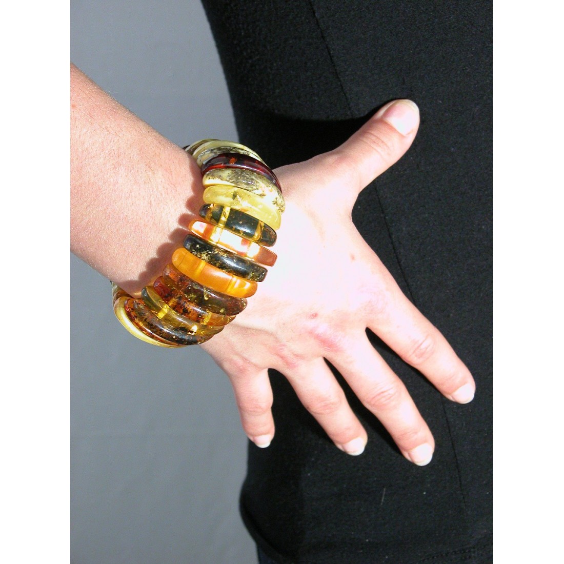 Bracelet de créateur, unique, composé de plusieurs lamelles d'ambre multicolore. Assemblées par deux lanières, ces lamelles ont une tenue parfaite. La variété des nuances de couleur que propose l'ambre donne du rythme et du relief au bracelet. Idéal à porter lors de grandes occasions comme au quotidien. Poids 66 grammes.