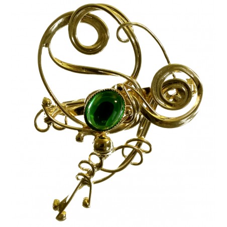 La pierre verte est un cabochon en verre teinté. Longueur de la broche : 55 mm.