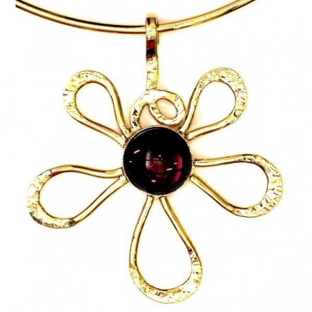 Très joli pendentif fantaisie de créateur fait main en forme de fleur, doré à deux microns au centre duquel on trouve un cabochon en verre coloré sur un tour du cou ouvert très facile d'utilisation.