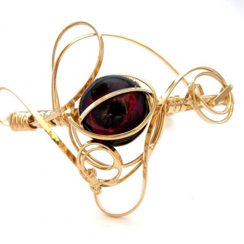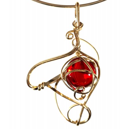 Collier artisanal doré, travaillé en fil de laiton et composé d'un tour du cou et d'un pendentif de 75 mm avec un cabochon en verre qui s'allie parfaitement à la couleur dorée du métal. Bijou fait main en France.