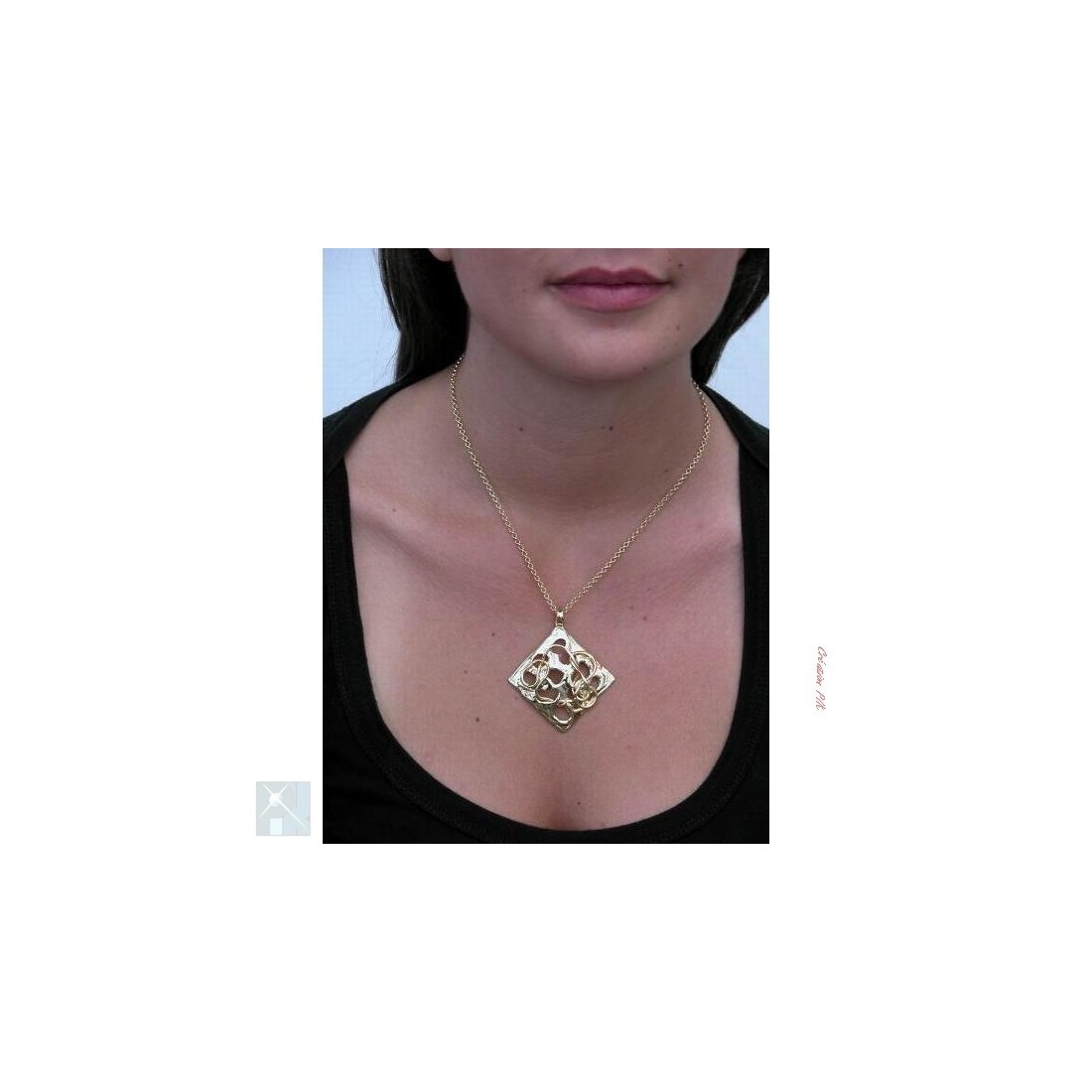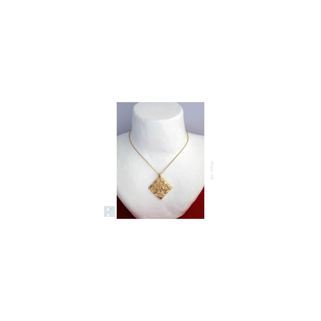 Pendentif confectionné en laiton en forme de losange à l' aspect très léger sur une chaîne de 45 cm de long. Ajouré en son centre, il présente des fils joliment entrecroisés. Vous pouvez choisir entre pendentif doré à l'or fin, en bronze vieilli ou en couleur cuivre très joli et bien moins cher.
