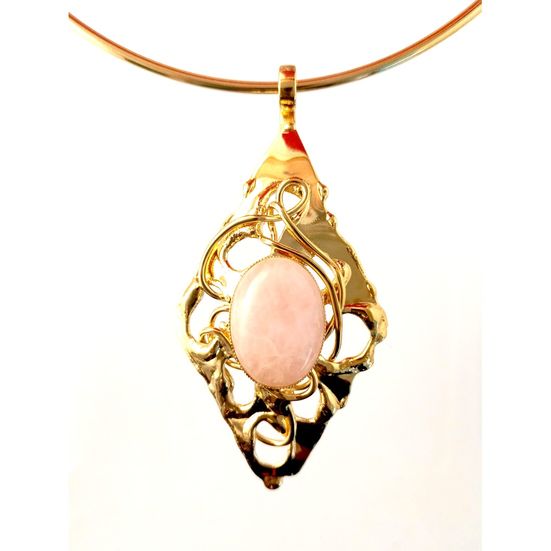 Cette jolie création est un petit pendentif réalisé à la main par un artisan créateur à Saint-Étienne. Plaqué à l’or fin, ce bijou fantaisie a quelque chose de délicieusement précieux. Les courbes voluptueuses des fils de laiton renferment un cœur en verre qui réfléchit malicieusement la lumière. Ce pendentif, agrémenté de sa chaîne courte apportera beaucoup d’élégance à vos tenues quotidiennes et une note de raffinement supplémentaire à vos plus belles robes de soirée.