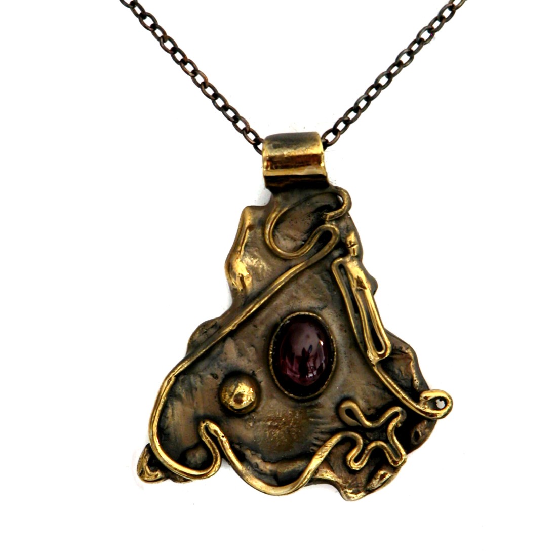 Petit pendentif en laiton et étain, couleur bronze vieilli, sur une chaîne de 45 cm de long. La longueur du pendentif seul est de environ 32 mm.
